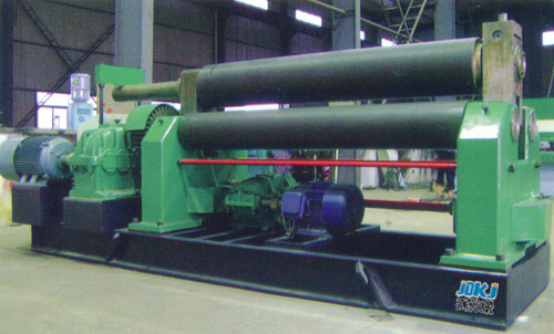 本機結構為三輥對稱式,上輥在兩下輥中央對稱位置作垂直長降運動,通過絲桿絲母蝸桿,傳動而獲得,兩下輥作旋轉運動,通過減速機的輸出齒輪與下輥齒嚙合,為卷制板材提供扭矩。